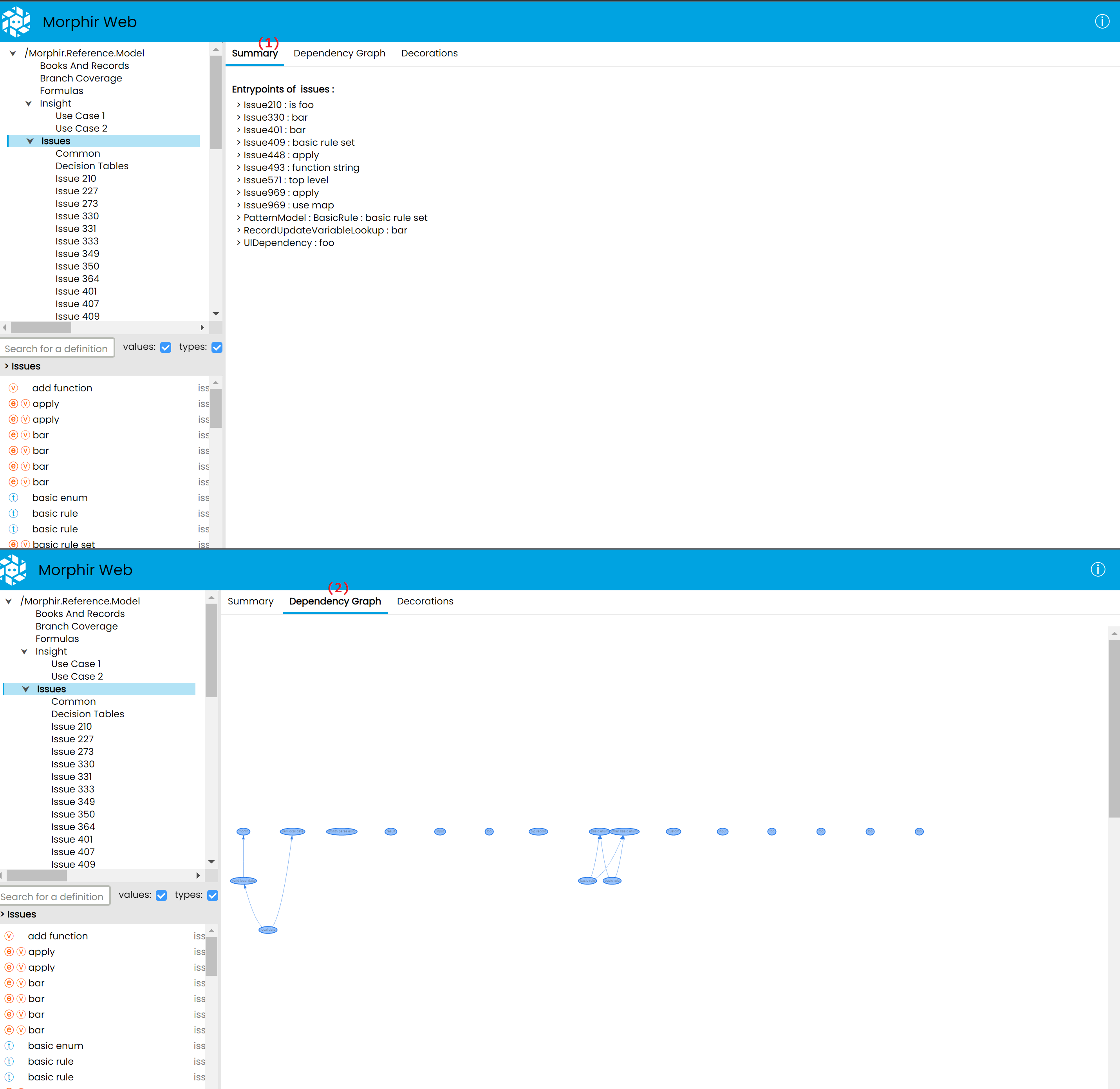 (1) The Insight view, an interactive visualisation of a Morphir definition, which will have it's own section below