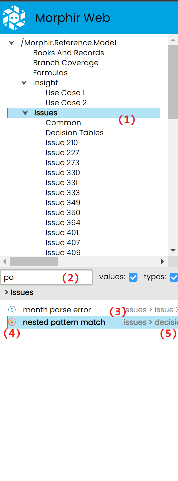The sidebar on the left is used to navigate the app. First the user needs to select a module in the top part, which will be highlighted in blue. (1) After a module is selected, a list of definitions will be displayed in the bottom part, which the user can further narrow down using the search bar in the middle (2), at which point a filtered list of definitions will be shown (3). The t or v on the left indicates whether the definition is a type or value (4), while it's exact position in the module subtree is indicated on the right in gray. (5)